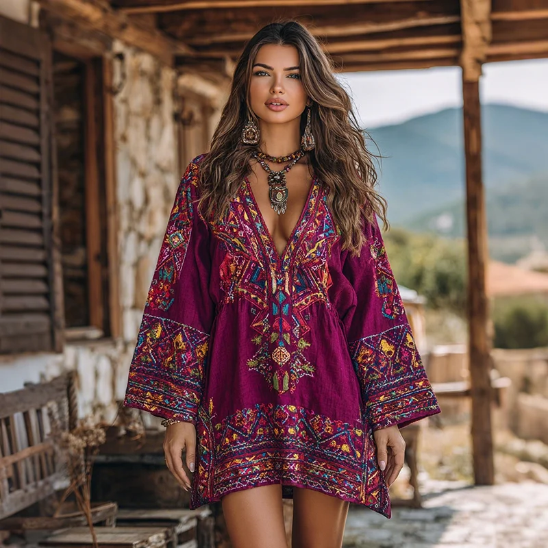 Women's Vintage Vacation Boho Tribal Ethnic Print V-neck Linen Blend Long Sleeve Dress