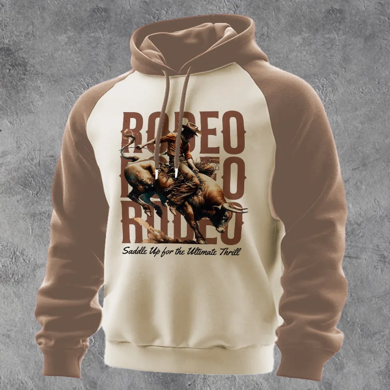 • Design Elements: Bold graphic print of a bull rider with "Rodeo" text, hooded design with drawstrings